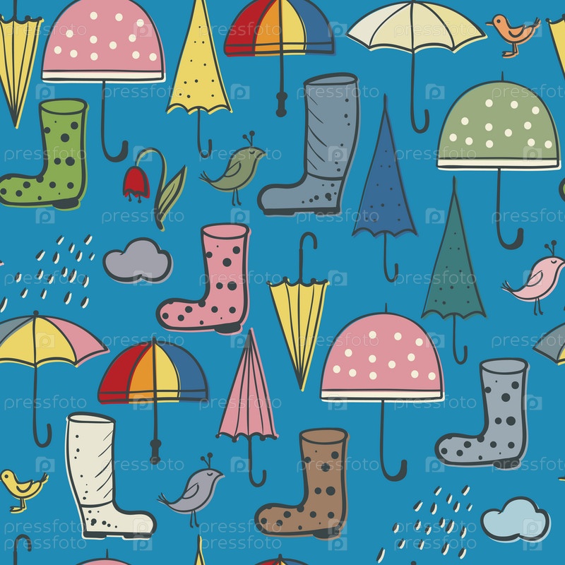 Бесшовный фон из зонтиков и ботинок, дождевых и весенних птиц