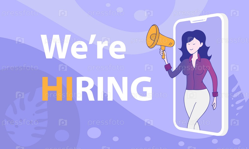 Милая женщина кричит в мегафон - мы нанимаем слово