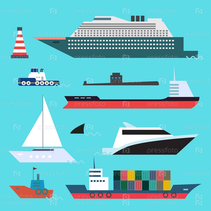 Плоский набор морского транспорта на фоне голубой воды