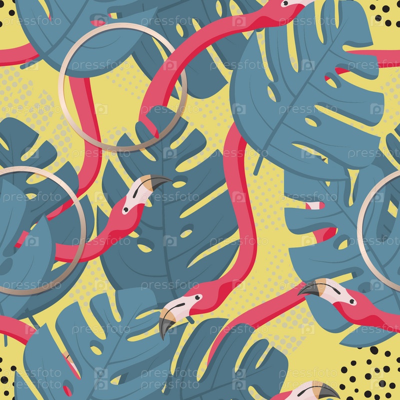 Розовые фламинго на фоне куста монстера