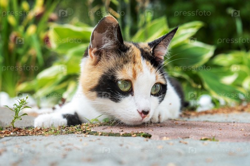 Милый молодой трехцветный бездомный кот лежит