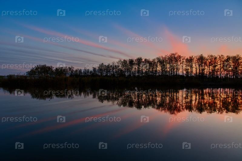 Осенний закат. Облачное небо и лес отражаются в воде озера
