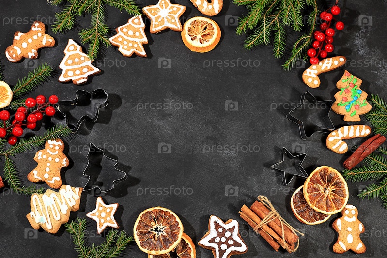 Рождественская новогодняя еда, традиционные праздничные пряники и мандарины с еловыми ветками, сосновыми шишками и украшениями, идея дизайна блюда и приготовления еды, фон 2024 года, концепция выпечки, выборочный фокус