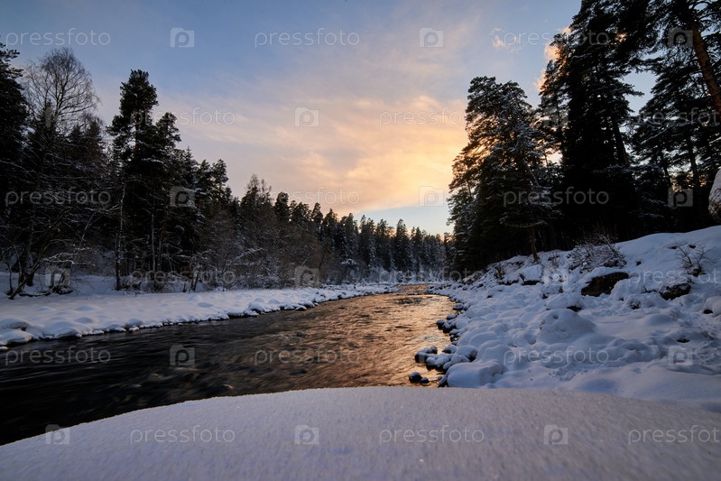 Зимняя горная река со снегом и зеленой водой на закате. Река Большой Зеленчук. Россия