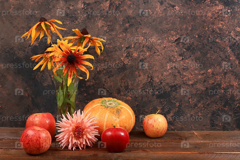 Осенний фон с яблоками, грушами, тыквами, цветами подсолнечника на деревянном столе, концепция Дня благодарения, деревенский урожай, концепция здорового натурального питания, баннер на экране, кафе, ресторан, выборочный фокус