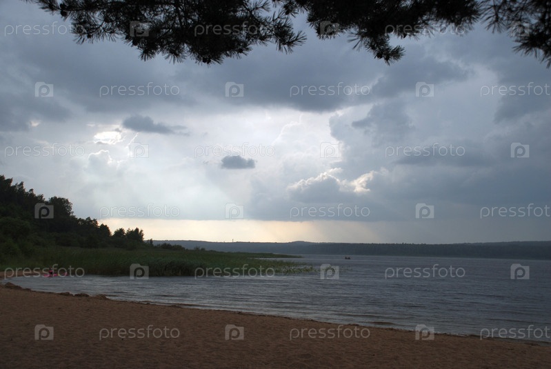 Серо-белые облака над широкой рекой