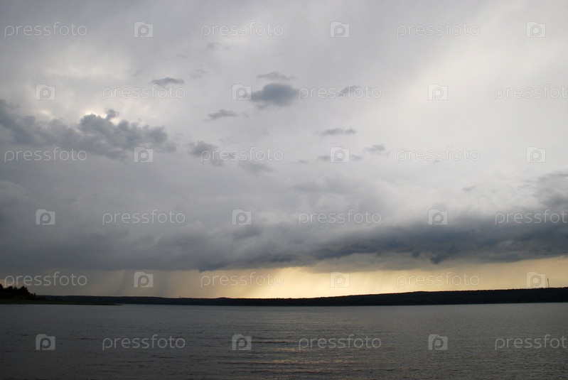 Серо-белые облака над темной рекой