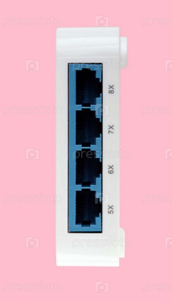 Белый 8-портный пластиковый коммутатор Ethernet изолирован на розовом фоне