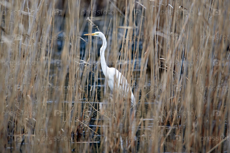 Большая белая цапля спряталась в камышах на озере
