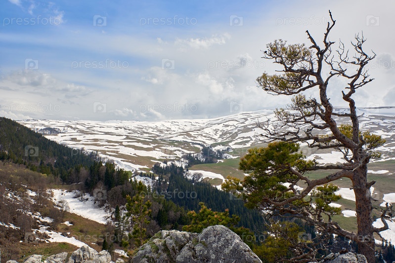 Одинокое дерево над скалой на фоне заснеженных гор