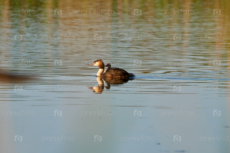 Большая хохлатая поганка плавает с птенцом на спине