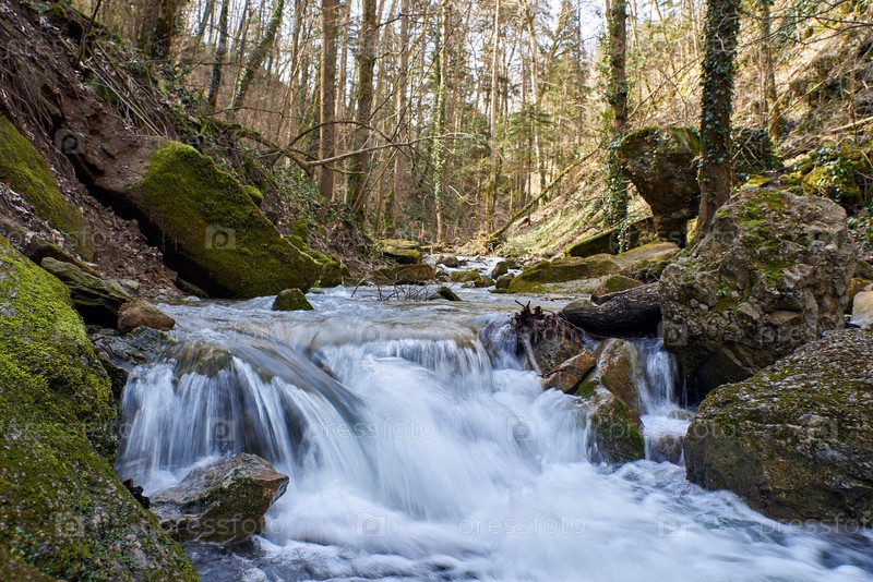 Перекаты горной реки, протекающей через лес, и валуны с зеленым мхом
