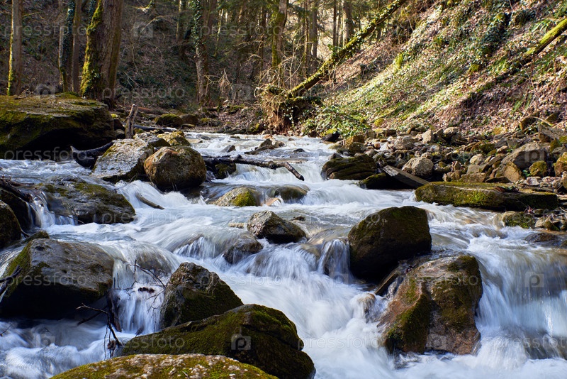 Перекаты горной реки, протекающей через лес, и валуны с зеленым мхом