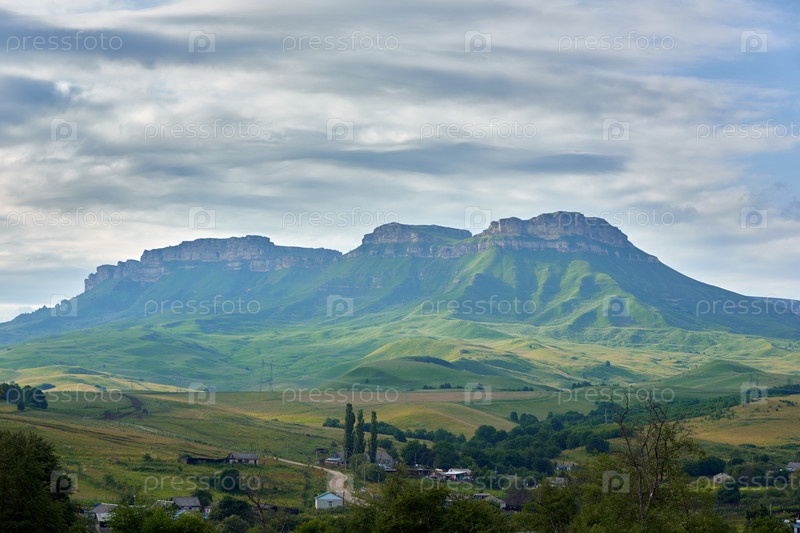 Маленькая деревня на фоне горного хребта и голубого облачного неба