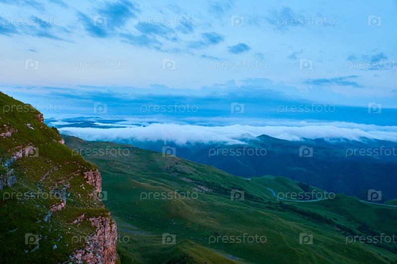 Облака заката, голубое небо и туман над горной долиной с деревней и извилистой дорогой