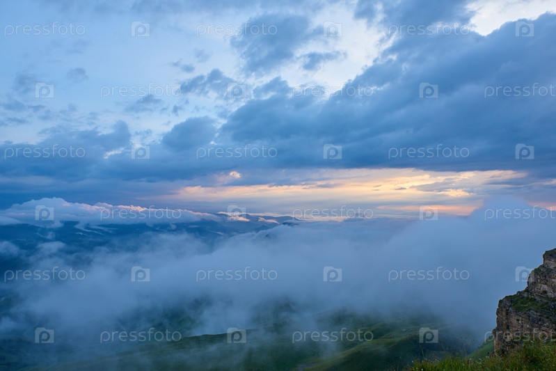 Закат освещает облака над горно-зеленой долиной в тумане