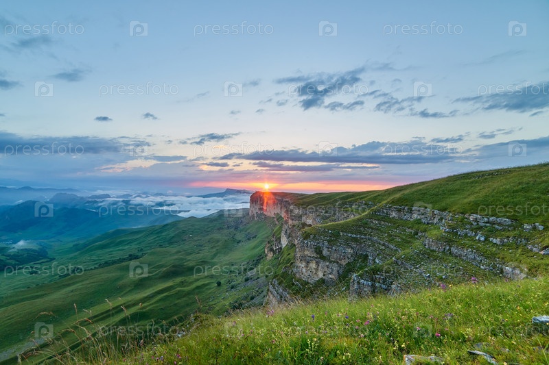 Закат в горах. Заходящее солнце освещает горный массив, туман и облака