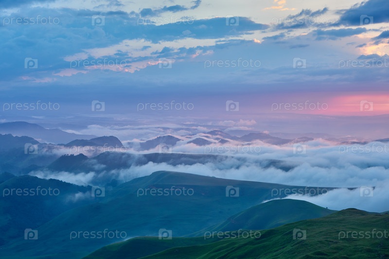 Облака заката, голубое небо и туман над горной долиной с деревней и извилистой дорогой