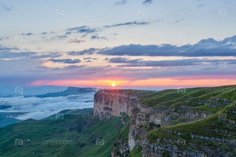 Закат в горах. Заходящее солнце освещает горный массив, туман и облака