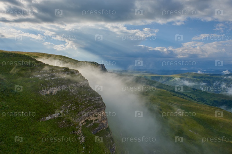 Косые лучи солнца сквозь туман над горным хребтом и долиной
