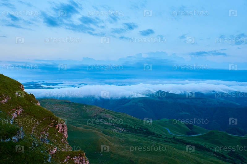 Облака заката, голубое небо и туман над горной долиной с деревней и извилистой дорогой