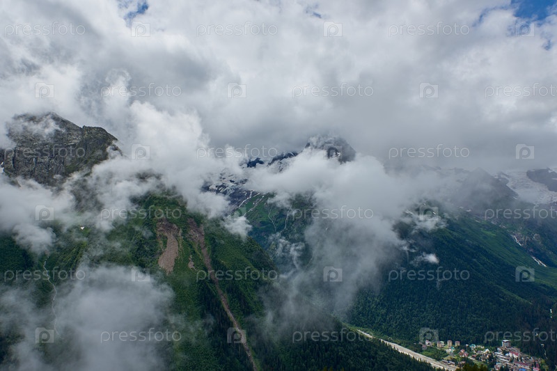 Горный зеленый хребет, покрытый соснами в тумане и облаках. Домбай, Россия