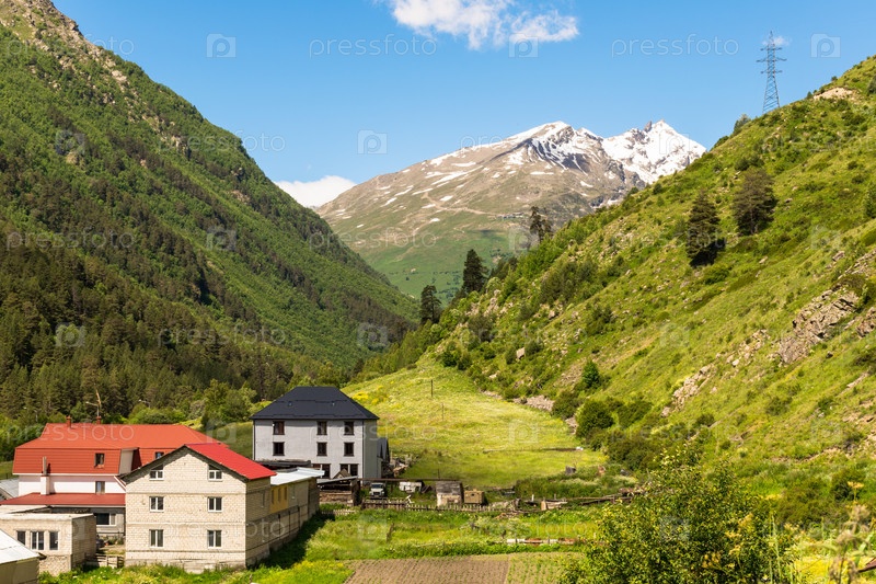 Жилые дома в ущелье с видом на заснеженную вершину