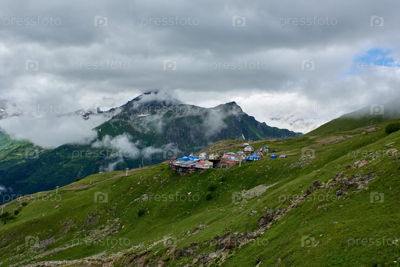 Дома на зеленом склоне и подъемнике. Домбай, Карачаево-Черкесия, Россия