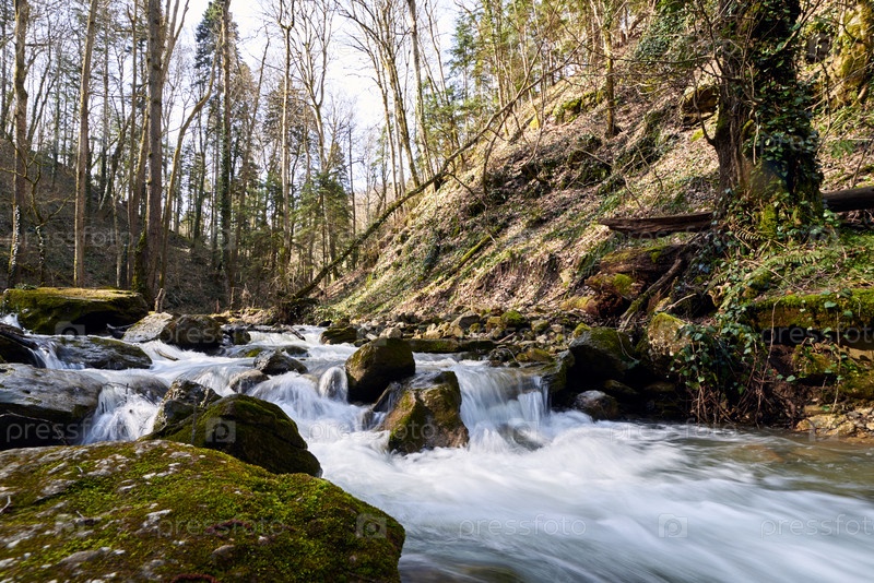 Перекаты горной реки, протекающей через лес, и валуны с зеленым мхом