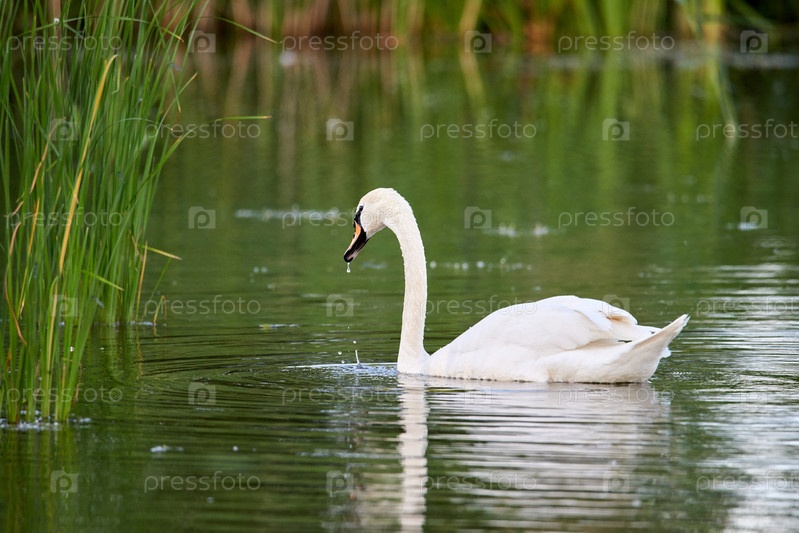 Дикий белый лебедь плавает по озеру с зеленой водой