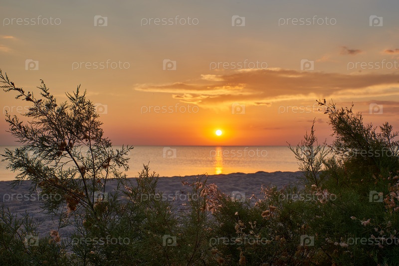 Зеленый куст на песчаном пляже на фоне заката