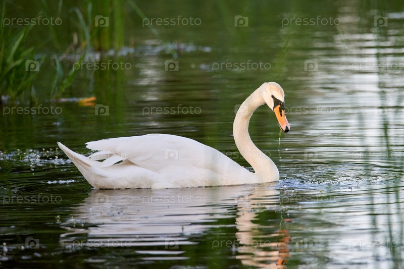 Дикий белый лебедь плавает по озеру с зеленой водой