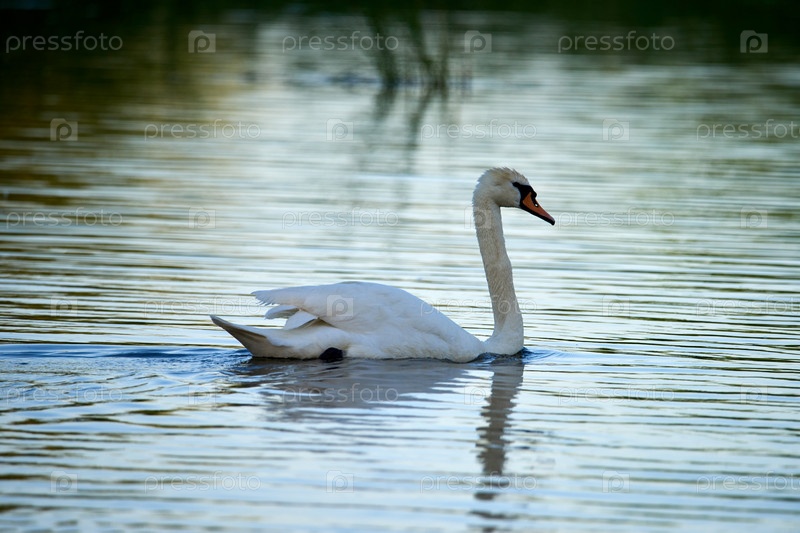 Дикий белый лебедь плавает по озеру с зеленой водой