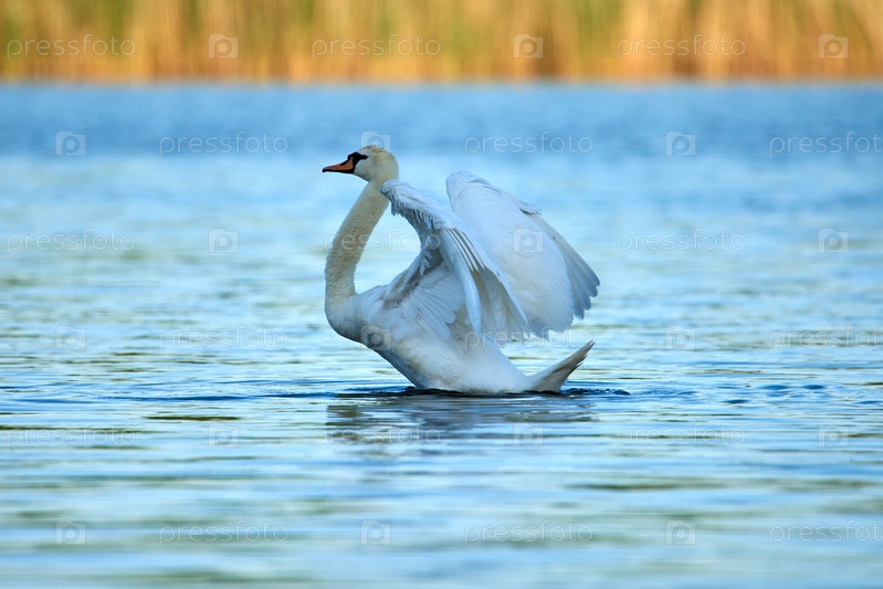 Дикий белый лебедь сидит на озере с голубой водой
