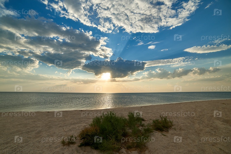 Зеленый куст на песчаном пляже на фоне заката