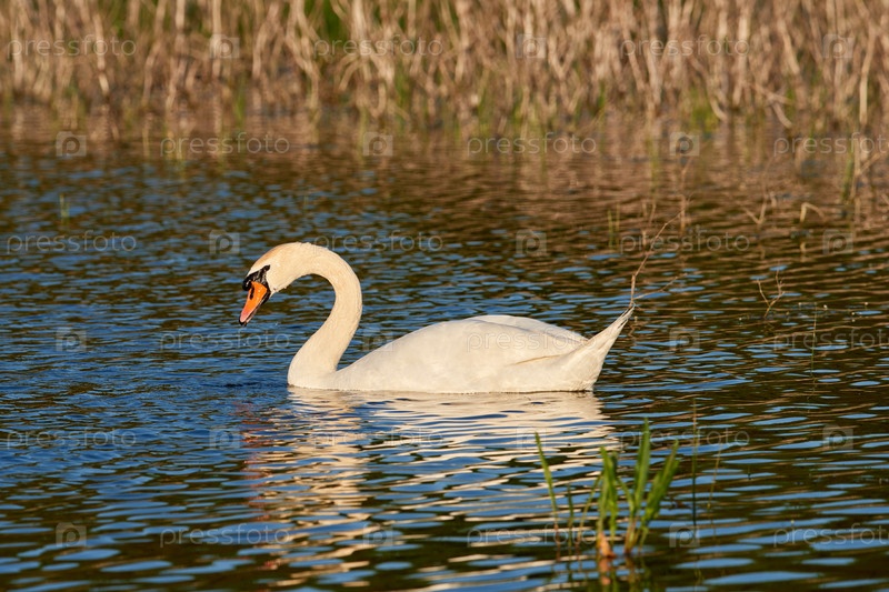 Дикий белый лебедь на озере с голубой водой в лучах заходящего солнца