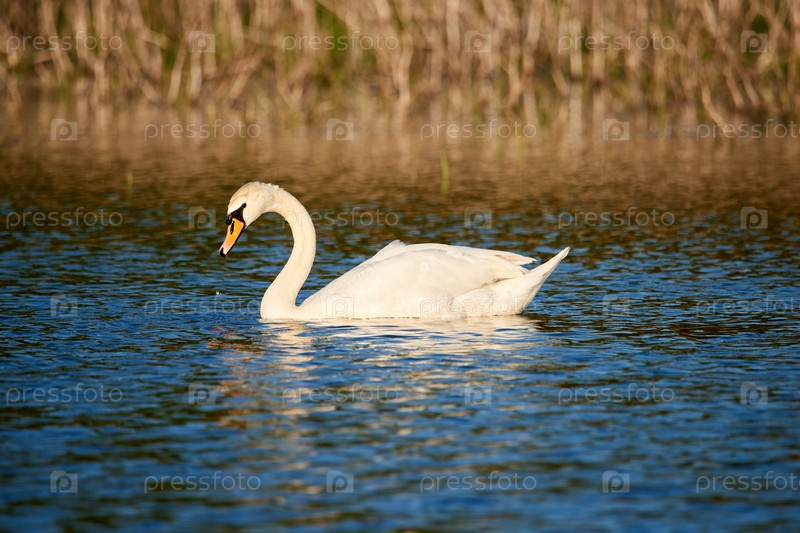 Дикий белый лебедь на озере с голубой водой в лучах заходящего солнца