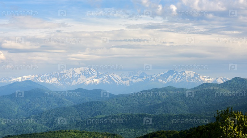Горы Северного Кавказа на закате. Заснеженные вершины на солнце