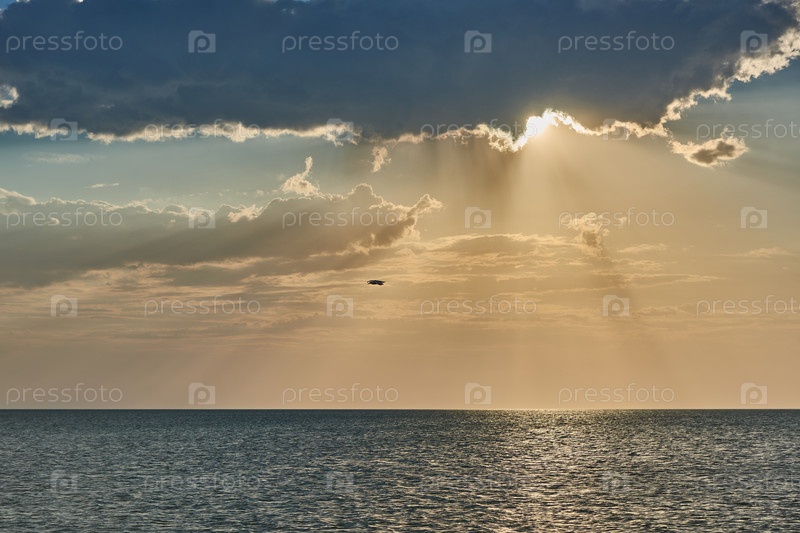 Чайка летит над морем в лучах заката