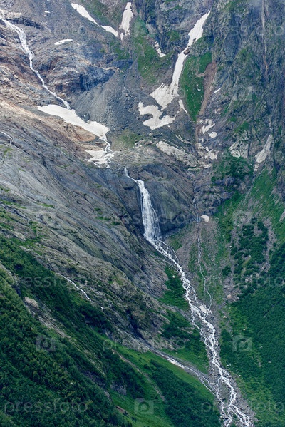 Ледник и ручей на хребте в облаках и тумане. Домбай, Россия