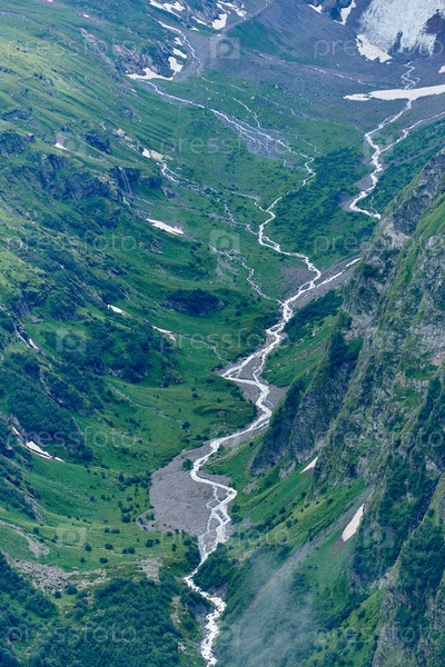Ледник и ручей на хребте в облаках и тумане. Домбай, Россия