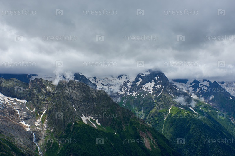 Ледник и ручей на хребте в облаках и тумане. Домбай, Россия