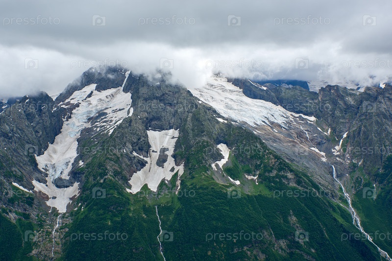 Горный зеленый хребет, покрытый соснами в тумане и облаках. Домбай, Россия