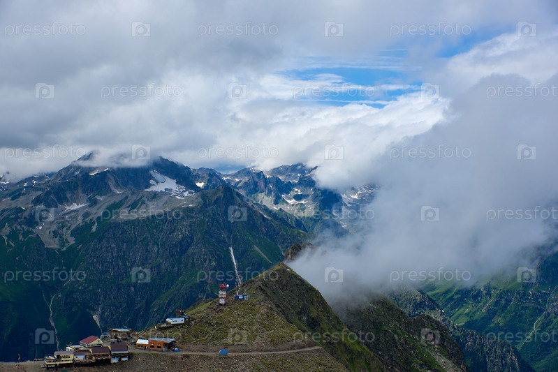 Скалы, покрытые туманом и облаками, с зелеными склонами. Домбай, Россия
