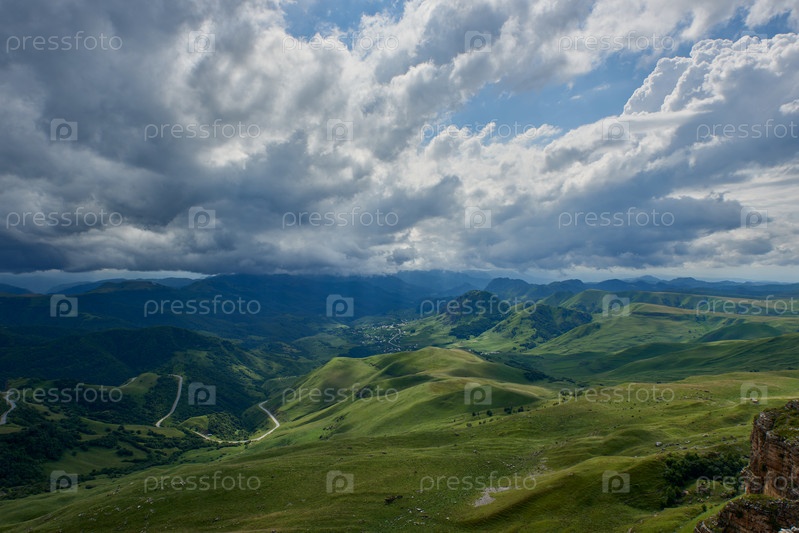 Грозовые облака над горной долиной с извилистой дорогой