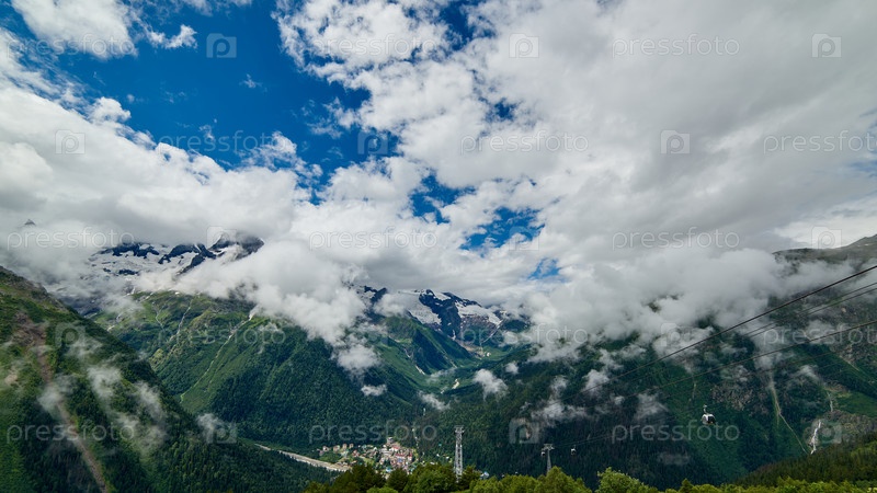 Горный зеленый хребет, покрытый соснами в тумане и облаках. Домбай, Россия