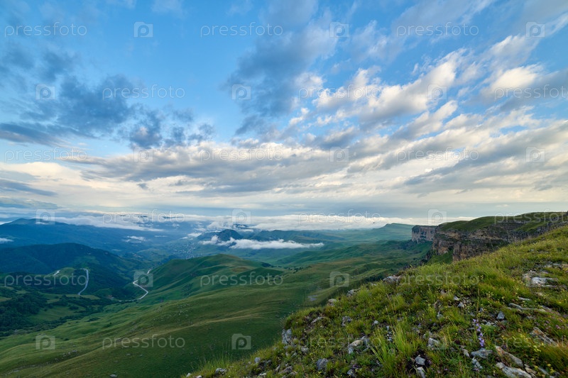 Кучевые облака на рассвете над зеленой горной долиной