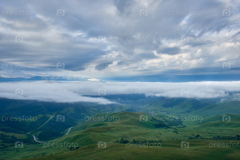 Кучевые облака на рассвете над зеленой горной долиной