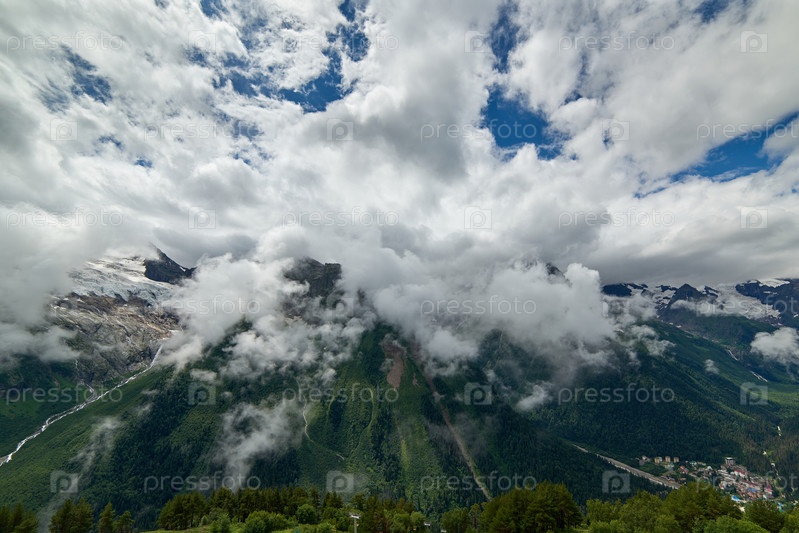 Горный зеленый хребет, покрытый соснами в тумане и облаках. Домбай, Россия