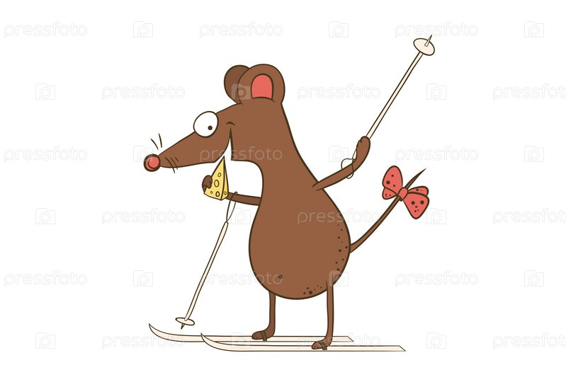 Мультяшный персонаж-забавная мышка катается на лыжах